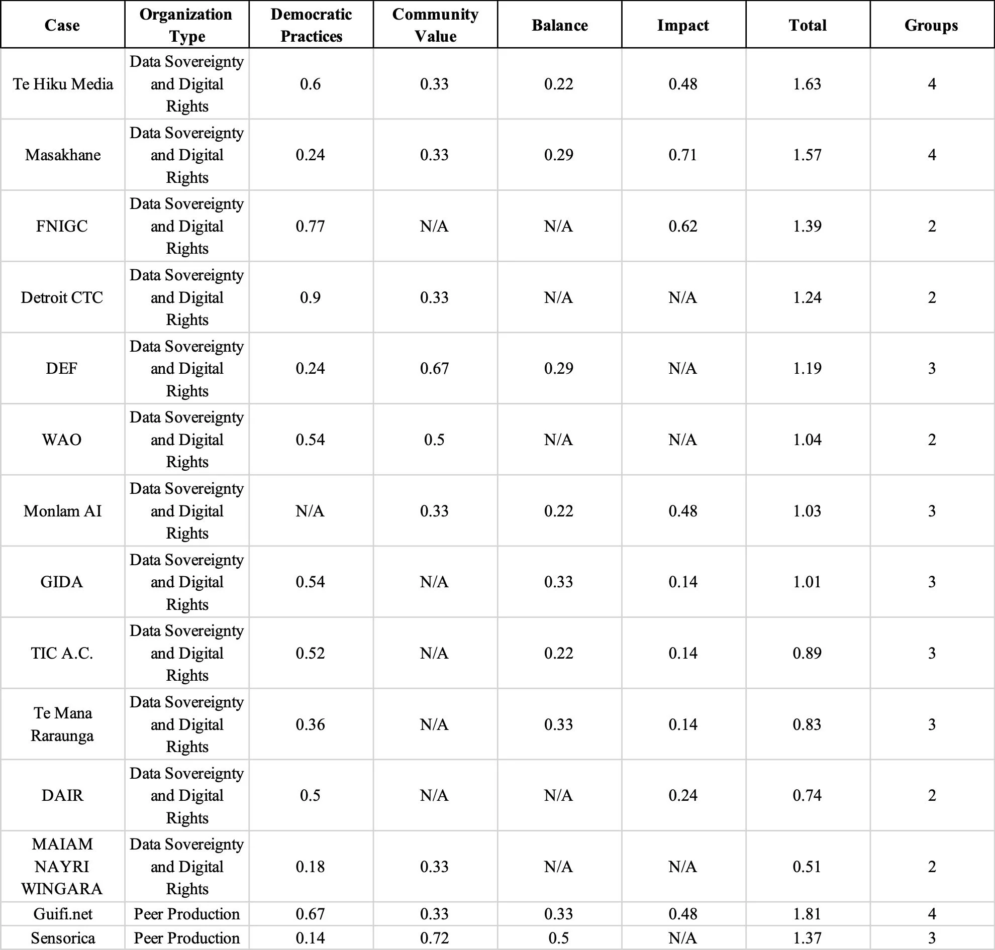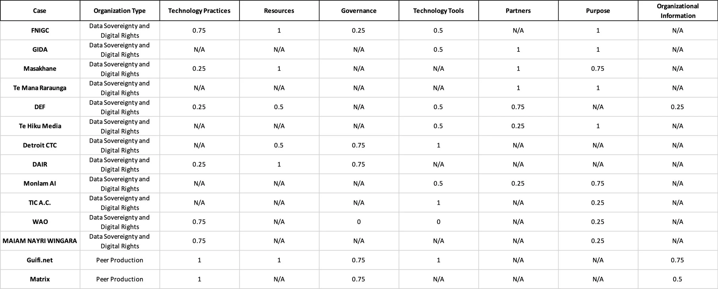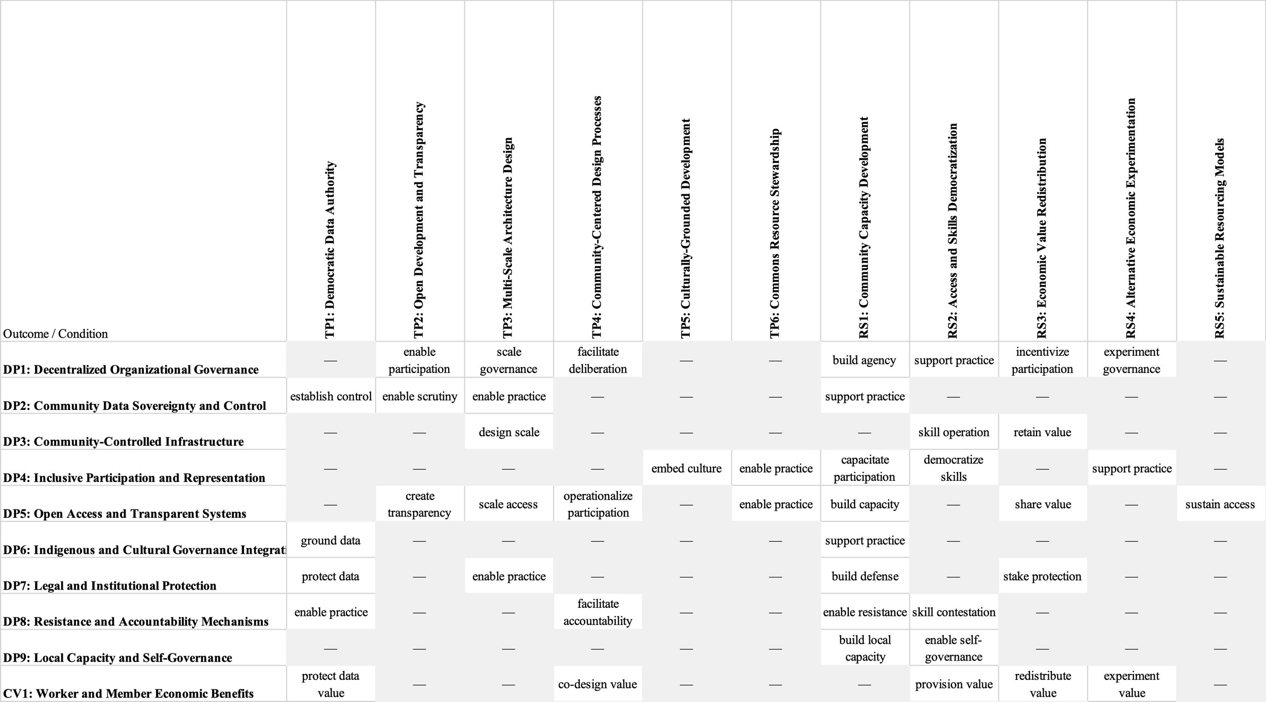 The image below is a section of the qualitative Outcomes x Conditions matrix. The link to the Excel file is here.